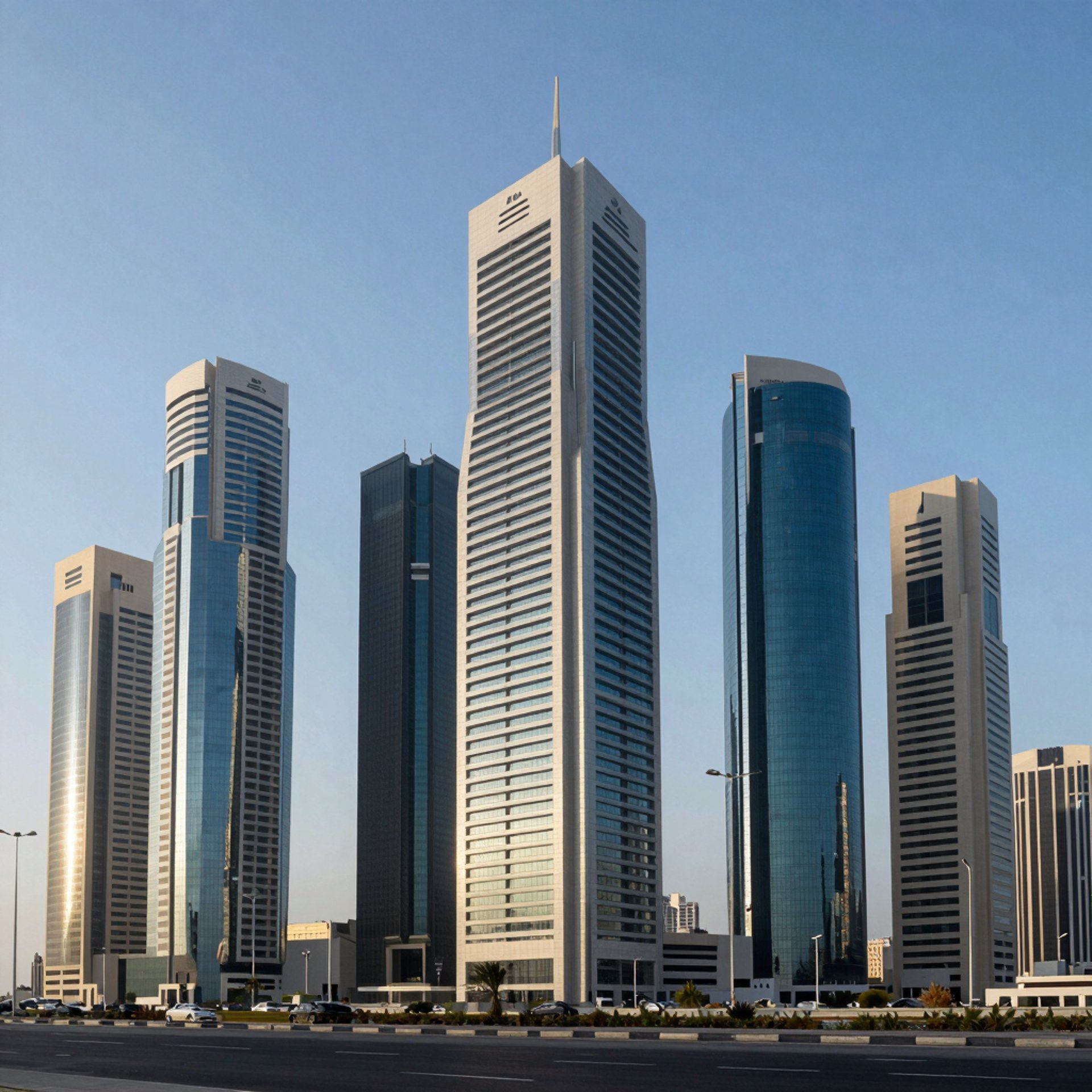 Modern minimalist corporate architecture in Ras Al Khaimah, clean lines of a business center under a clear sky, symbolizing growth and stability.